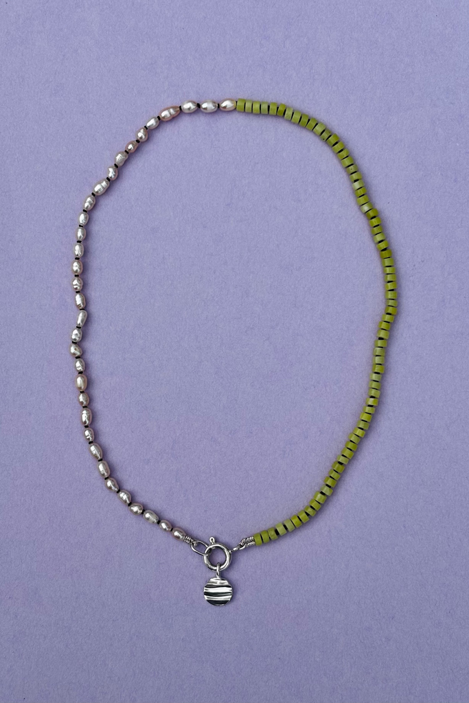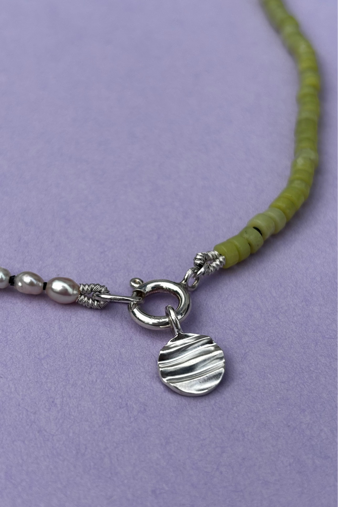 Ásvány: jáde (2-3 mm) és tenyésztett édesvízi halvány rózsaszín gyöngy (5-6 mm)
